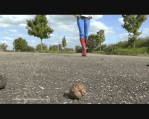 Lady B is in a playful mood as she crushes a bunch of walnuts outside. She is wearing tight blue denim jeans and her new red boots with spiked heels. The playful beauty doesn't just crush them underneath the soles of her boots for she also jumps on them and grinds them with her heels. Lady B leaves the crushed walnuts in the middle of the road for someone else to clean up.